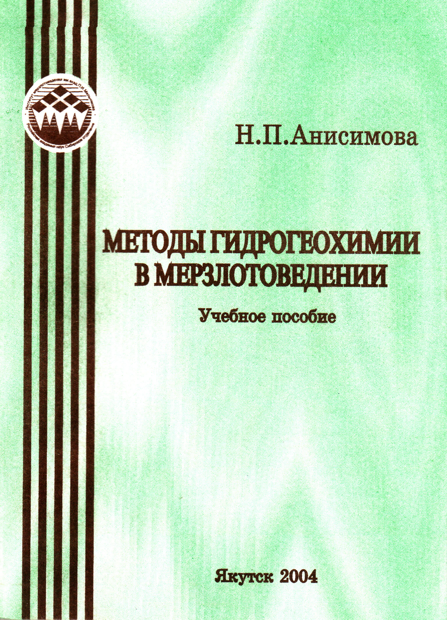Анисимова Н.П. Методы гидрогеохимии в мерзлотоведении: Учебное пособие/ Н.П. Анисимова; Ред. В.В. Шепелев. - Якутск: Изд-во Института мерзлотоведения СО РАН, 2004. - 78 с. 250 экз.