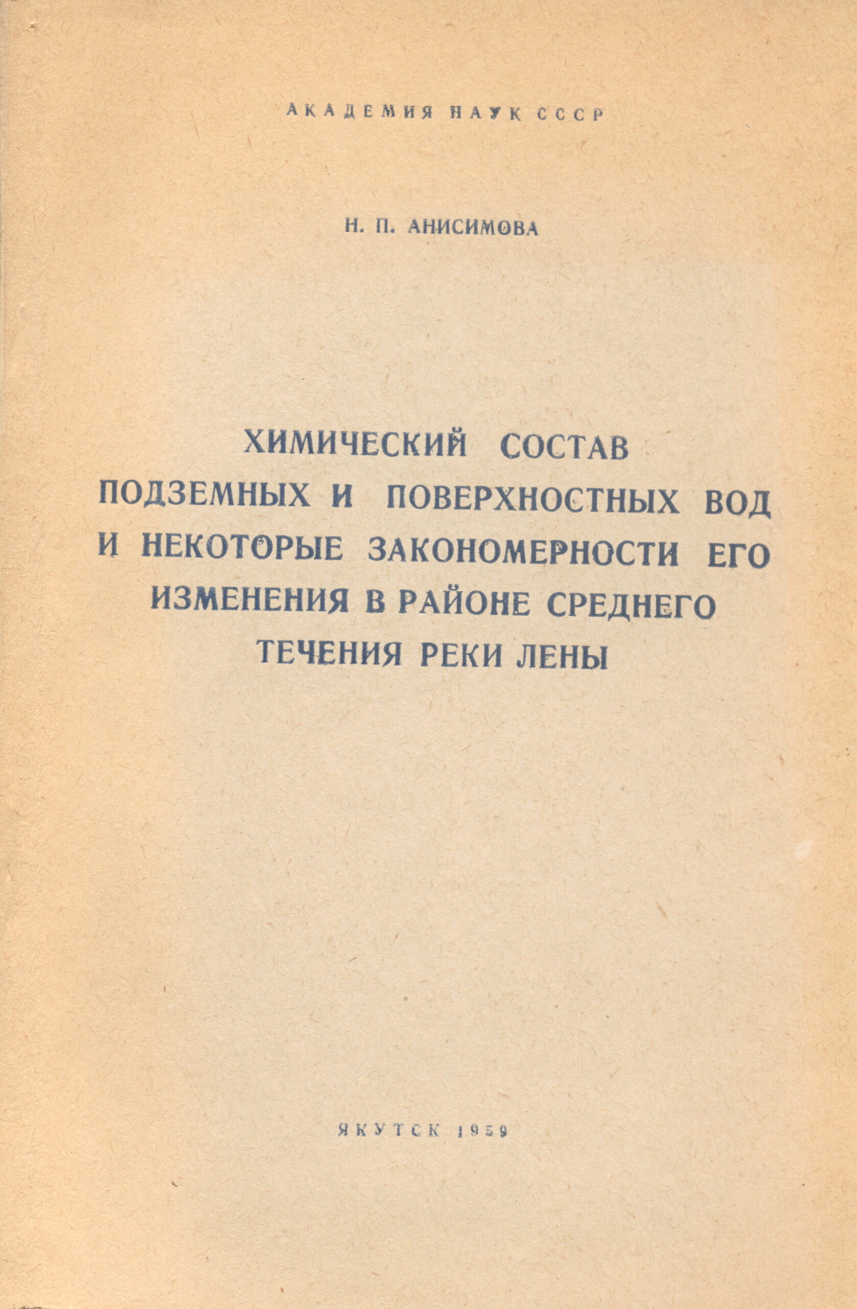 Анисимова Н.П. Химический состав подземных и поверхностных вод и некоторые закономерности его изменения в районе среднего течения р. Лены. - Якутск: Книжн. изд-во, 1959. - 120 с.