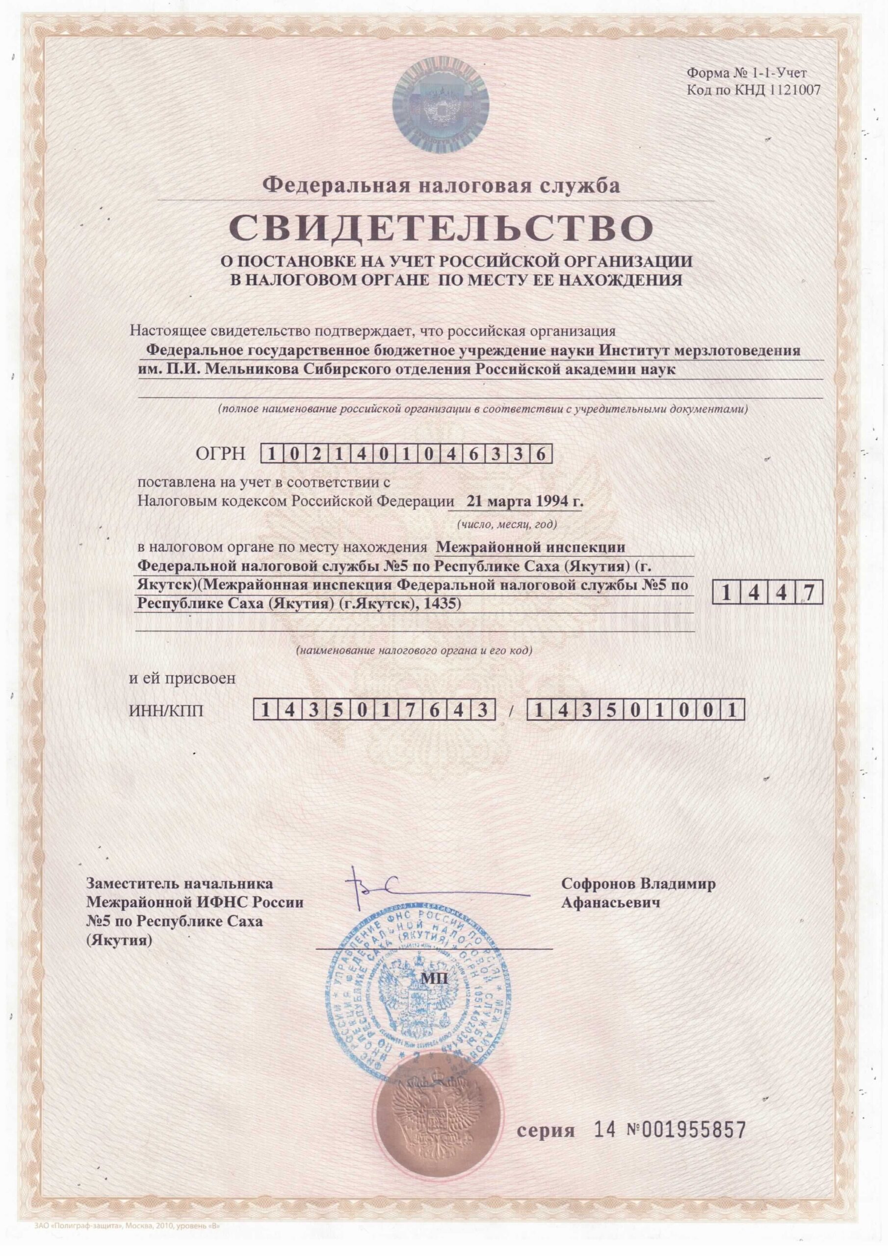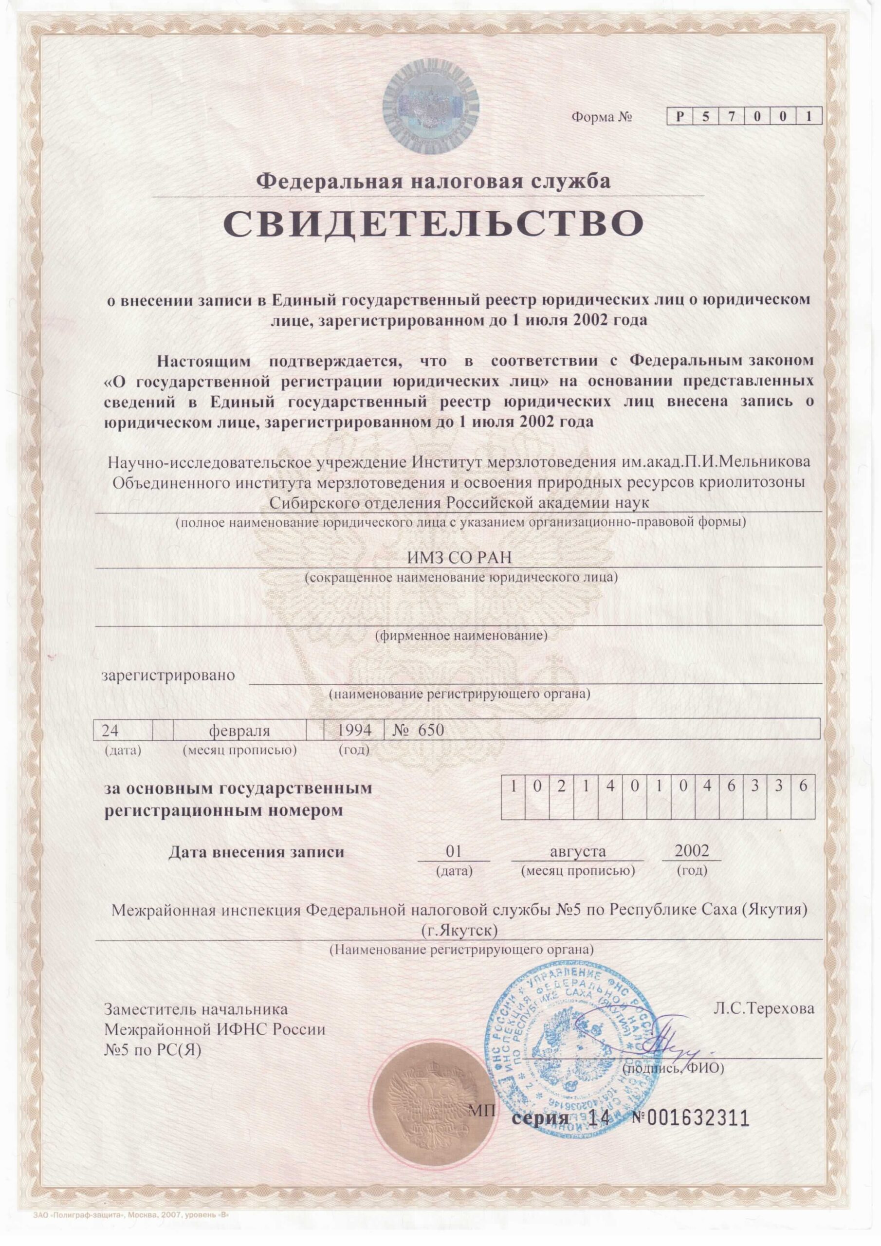 - Свидетельство о постановке на учет ИМЗ СО-РАН
