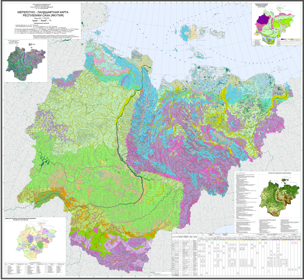 - Составлена Мерзлотно-ландшафтная карта Республики Саха (Якутия) масштаба 1:1 500 000, которая предоставила новую интерпретацию дифференциации многолетнемерзлых пород для такого большого региона, как Якутия. Использование в классификации картографируемого объекта сочетания двух факторов – геокриологического и ландшафтного, позволило более детально рассмотреть закономерности устройства природной среды, и внести свой вклад в изучении природы и охраны окружающей среды Севера.