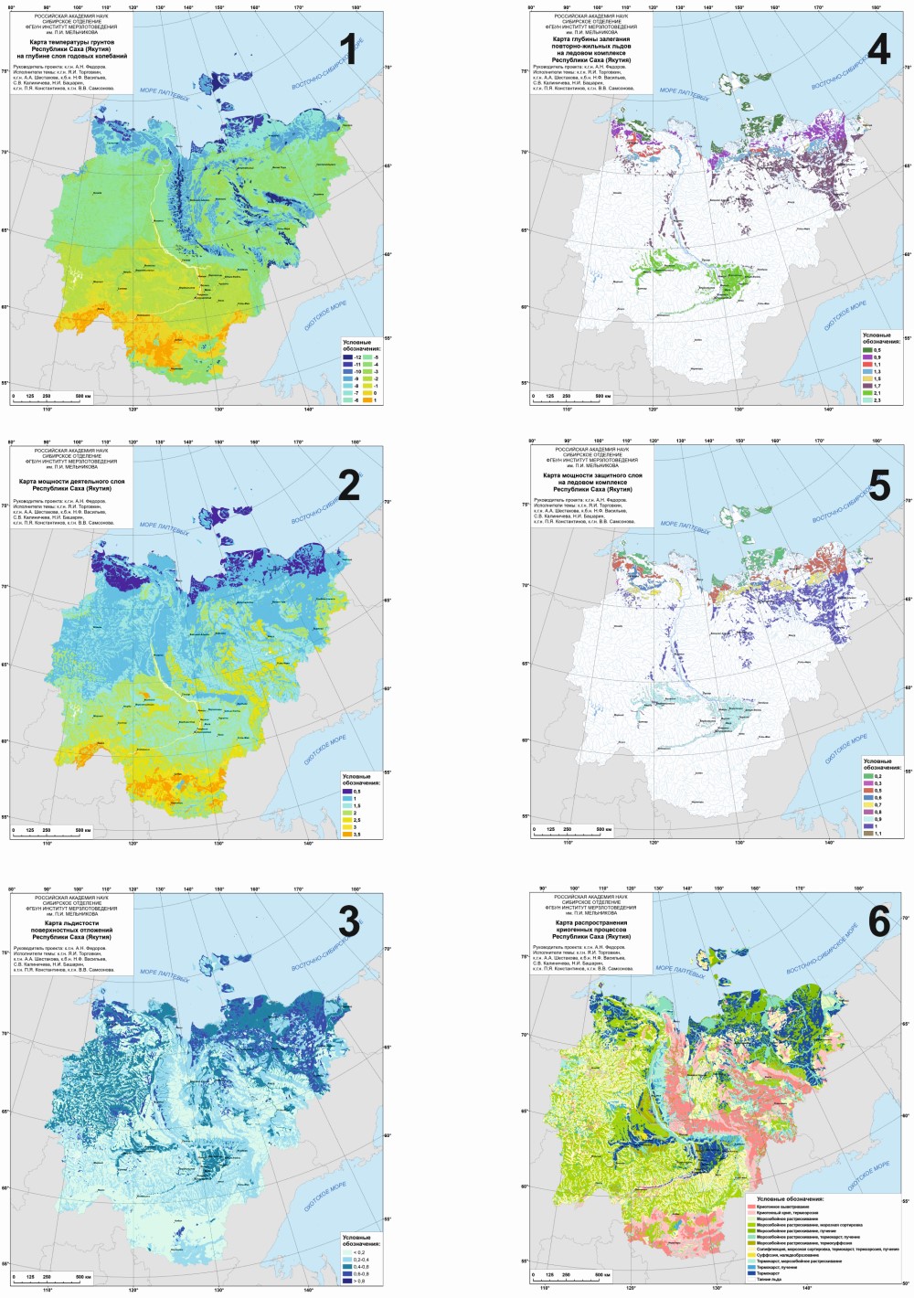 - Составлены цифровые тематические карты современного состояния мерзлотных ландшафтов Якутии масштаба 1:1 500 000 – температуры грунтов, глубины деятельного слоя, льдистости отложений, глубины залегания повторно-жильных льдов на ледовом комплексе, мощности защитного слоя и распространения криогенных процессов.